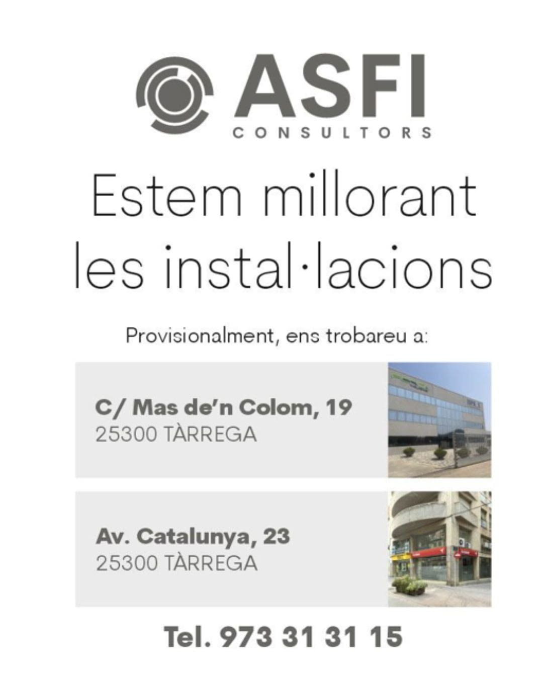 Ens complau anunciar-vos que ben aviat inaugurarem la nostra nova oficina a Tàrrega, situada al C/ Raval del Carme, 79.